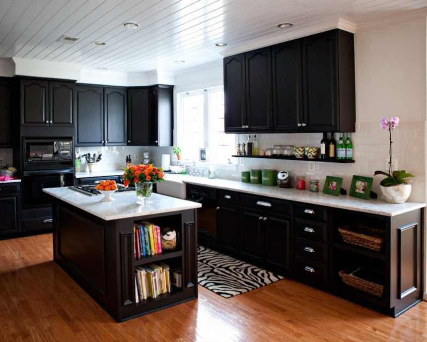Цвет венге и черный — такой вариант рекомендуется выбирать только в случае, если кухня достаточно просторная и хорошо освещена. Цвет венге в данном случае должен быть светлым. Он выступает в роли основного и является фоном для черных элементов интерьера. Черным в данном случае может быть наливной пол, элементы фасадов и фурнитура.