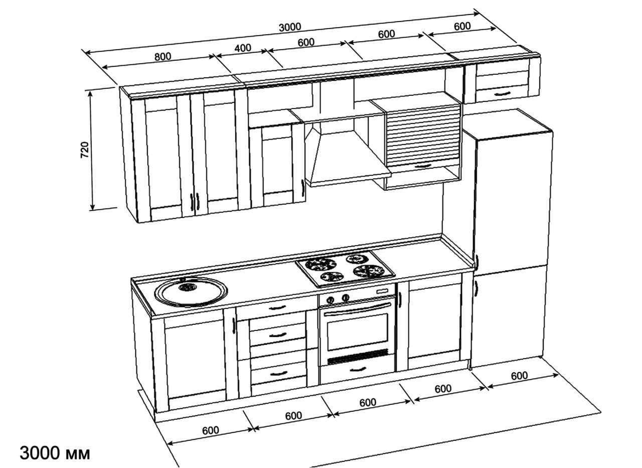 Может оказаться, что стены не вполне ровные, и это необходимо учитывать. Размеры кухни нужно нанести на чертёж, и на нём же отмечаются габариты устанавливаемой кухонной техники и мебели.