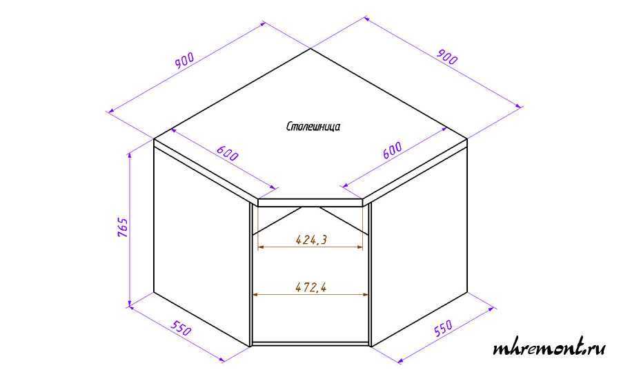 Отличительной особенностью обладает угловой кухонный гарнитур. Угловой кухонный шкаф может быть нескольких вариантов: прямой (рис. 2) и с углом 135 градусов (рис. 3). Та же особенность относится и к верхнему ряду (рис. 4).
