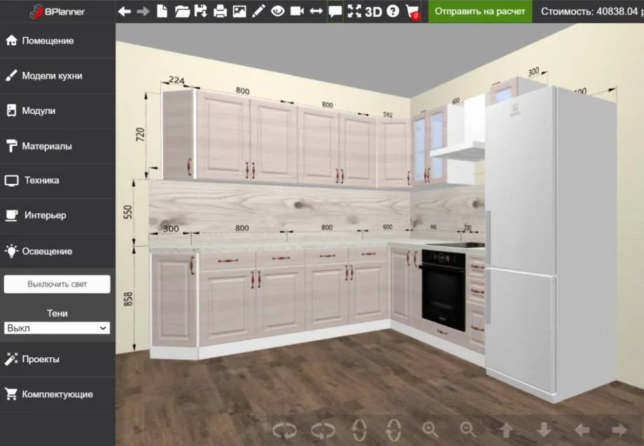 Объемную схему кухни можно поворачивать и увеличивать для внимательного изучения мелких деталей.