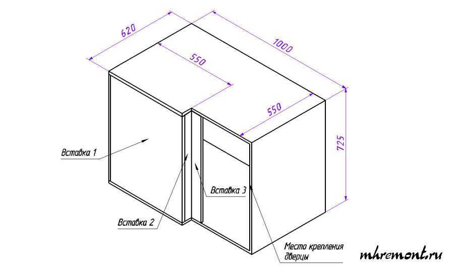 Рис.4. Угловой навесной кухонный шкаф чертеж.