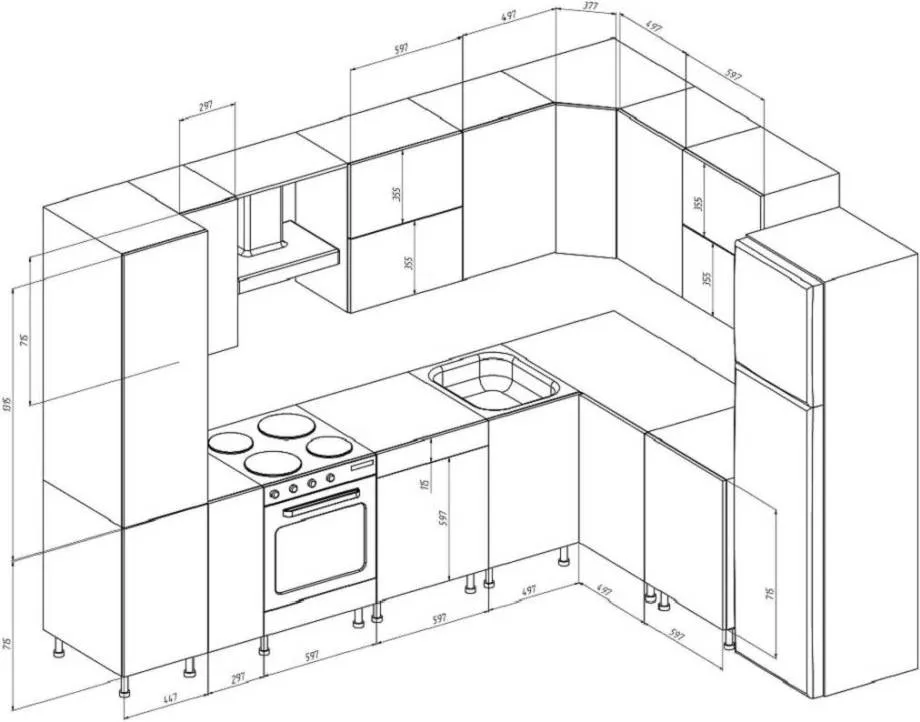 После уточнения исходных условий создают комплект проектной документации. На первом этапе применяют стандартные размеры кухонных шкафов.