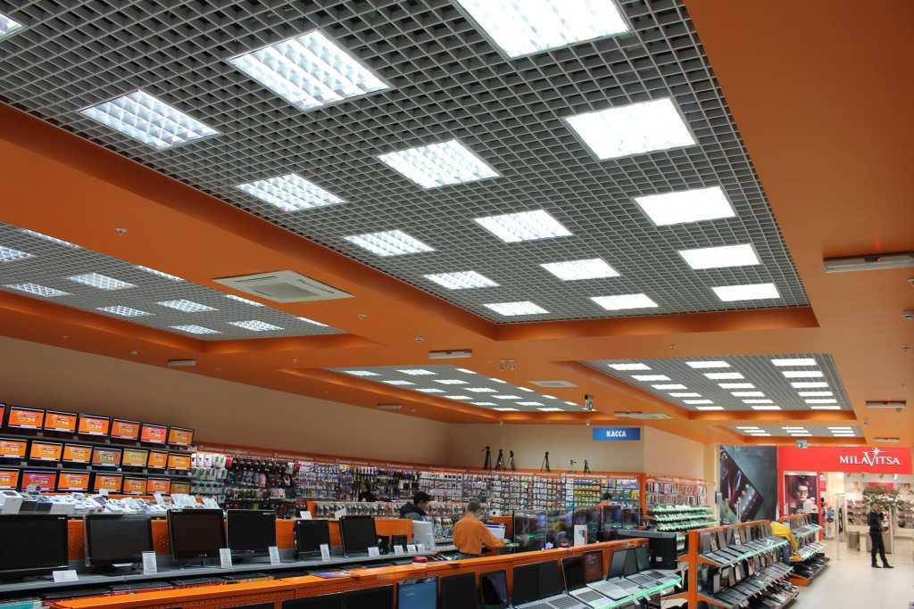 Распространенный вариант для «Грильято» – это использование растровых светильников, которые предназначены специально для ячеистых потолков. В них применяются преимущественно люминесцентные лампы с довольно низким энергопотреблением, но они способны рассеивать достаточное количество света.