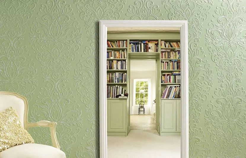 Окрашивание обоев с фигурным рисунком фисташковым цветомИсточник gidpokraske.ru