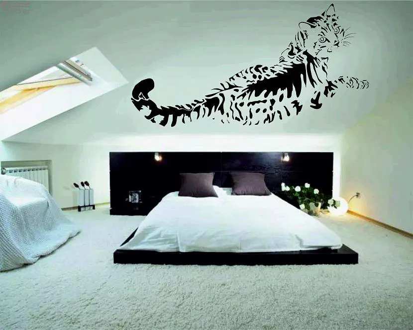 - Черная наклейка на белых обоях – тренд сезона. Также популярны и светлые силуэты, например, наклеенные на темную поверхность шкафа-купе.