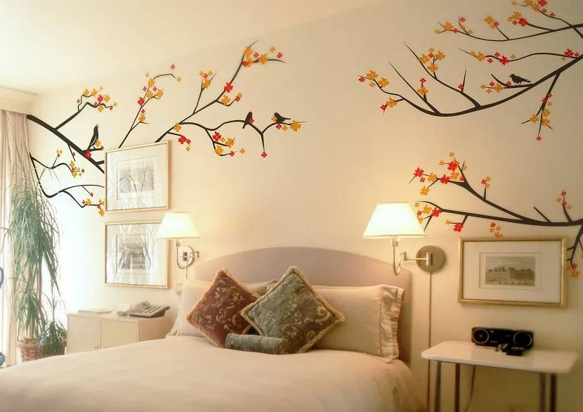 В спальне будут хорошо смотреться спокойные рисунки с животными, растениями. Также здесь можно разместить цветок лотоса или какой-нибудь этнический узор. При желании можно разместить похожие по тематике рисунки на стене над кроватью и, например, на зеркальных дверцах шкафа-купе.