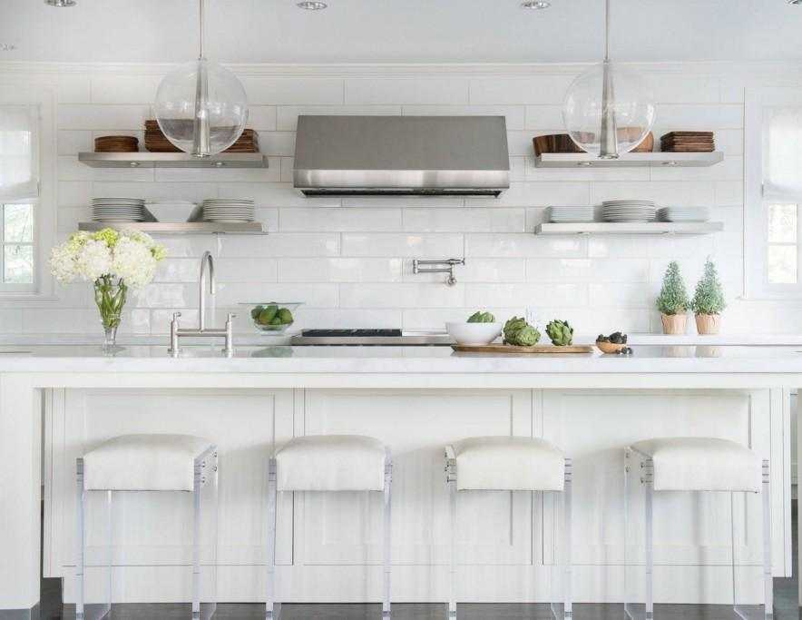 Также достаточно часто в интерьере кухни встречаются полки из закаленного стекла, которые смотрятся очень хрупкими, но при этом выдерживают практически любую нагрузку. Данные прозрачные конструкции могут иметь скрытый крепеж, что создает ощущение парения предметов в воздухе.