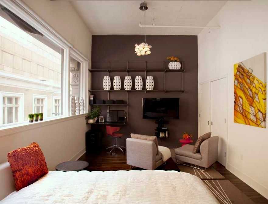 У окна используют открытые атрибуты, потому как они чудным образом могут сочетаться с журнальным столиком. Подвесные полки – экономия пространства.