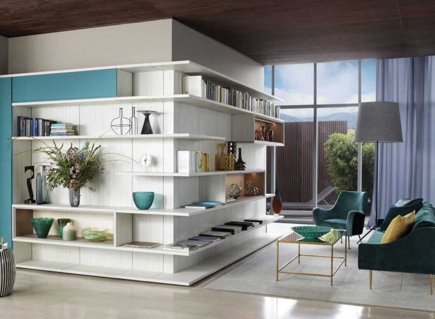 Этот вариант представляет собой несколько (от двух до желаемого количества) опор и закрепленных на них горизонтальных полок. Основа выполняется из разных материалов, от гипсокартона до натурального дерева. Часто кроме своей основной функции – размещения разных предметов,- стеллажи используют и в качестве перегородки для зонирования пространства.