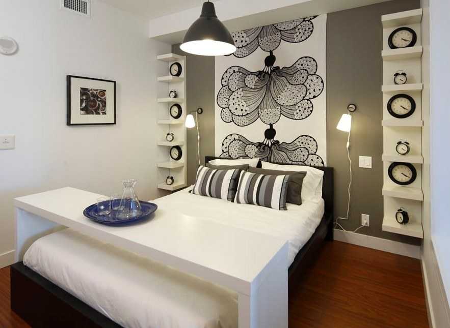 Полки над кроватью могут стать важным элементом декора, помогающим не только украсить комнату, но и организовать пространство более рациональным способом. Они подойдут тем, кто не любит загромождать комнату объемными предметами мебели, или тем, кто любит частые перемены в интерьере.