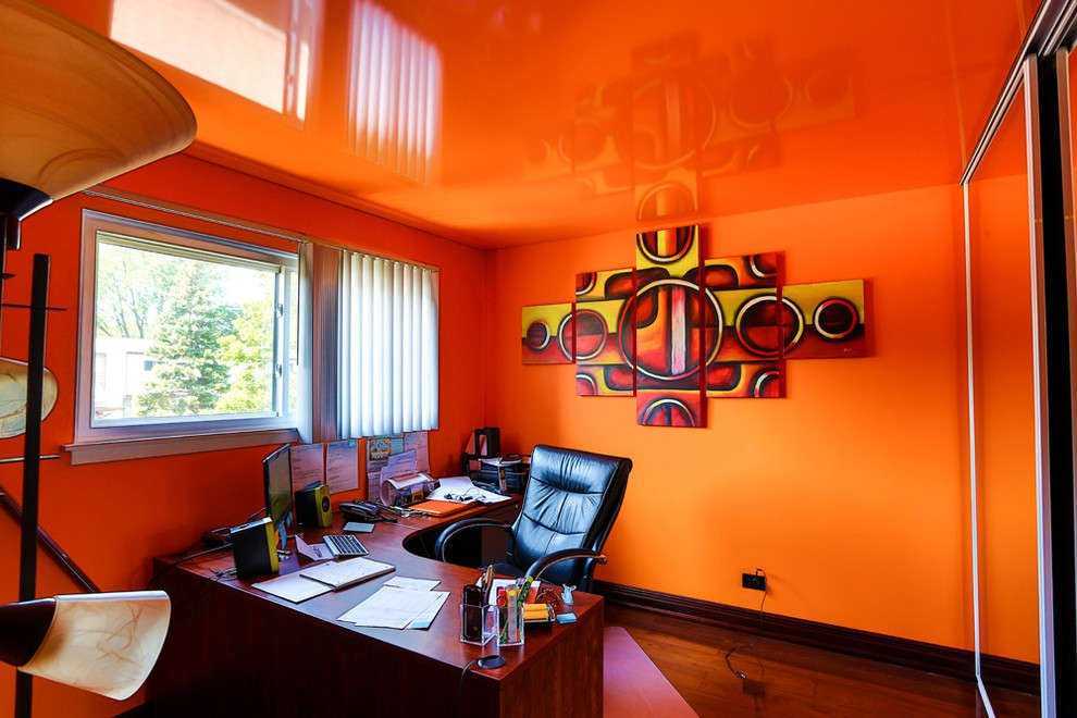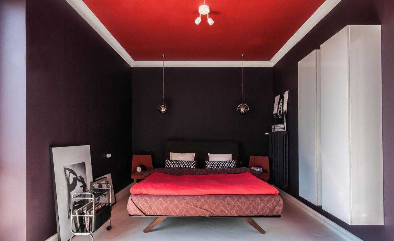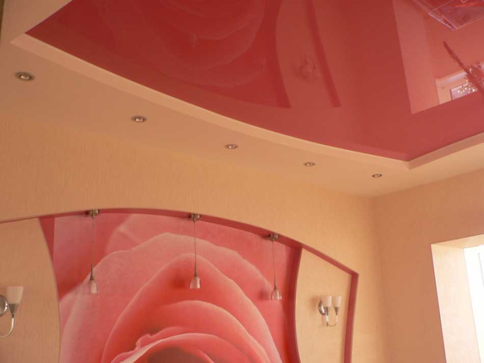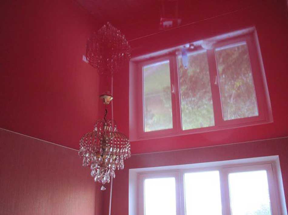 Окрашенный потолок хорош тем, что можно подобрать идеальный желаемый оттенок красного. Покраска выполняется на заранее подготовленную ровную поверхность. Эффект после нанесения может быть глянцевый и матовый.