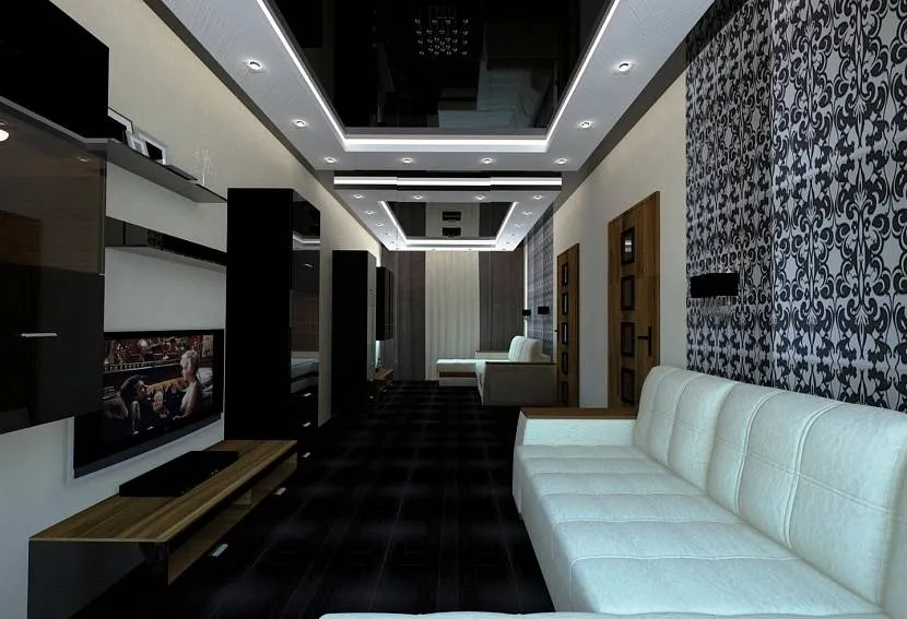 Помещение гостиной считается центральным местом в доме, поэтому должно быть уютным и презентабельным, как на фото. Натяжное полотно отражает свет и расширяет пространство в зале.