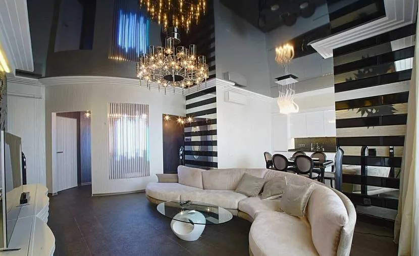 Глянцевые потолки — абсолютно гладкие, преломляют свет в одном направлении и оттого создают впечатление неоднородными по цвету. Участки, на которые падают лучи, кажутся светлее остальных, но в целом поверхность выглядит темнее. Такую фактуру используют, когда хотят зрительно увеличить высоту помещения.