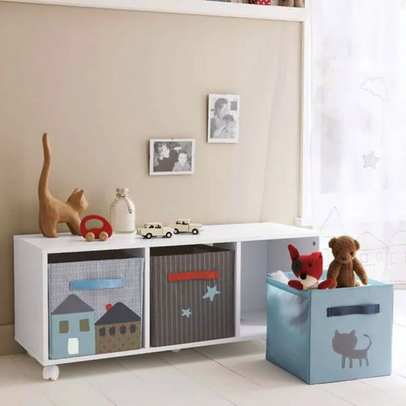 Тумбочки в форме кубиков – прекрасная вариация привычного ящика для общей детской спальни. Они занимают не большое количество площади комнаты, в них можно прятать вещи и использовать вместо стульев.