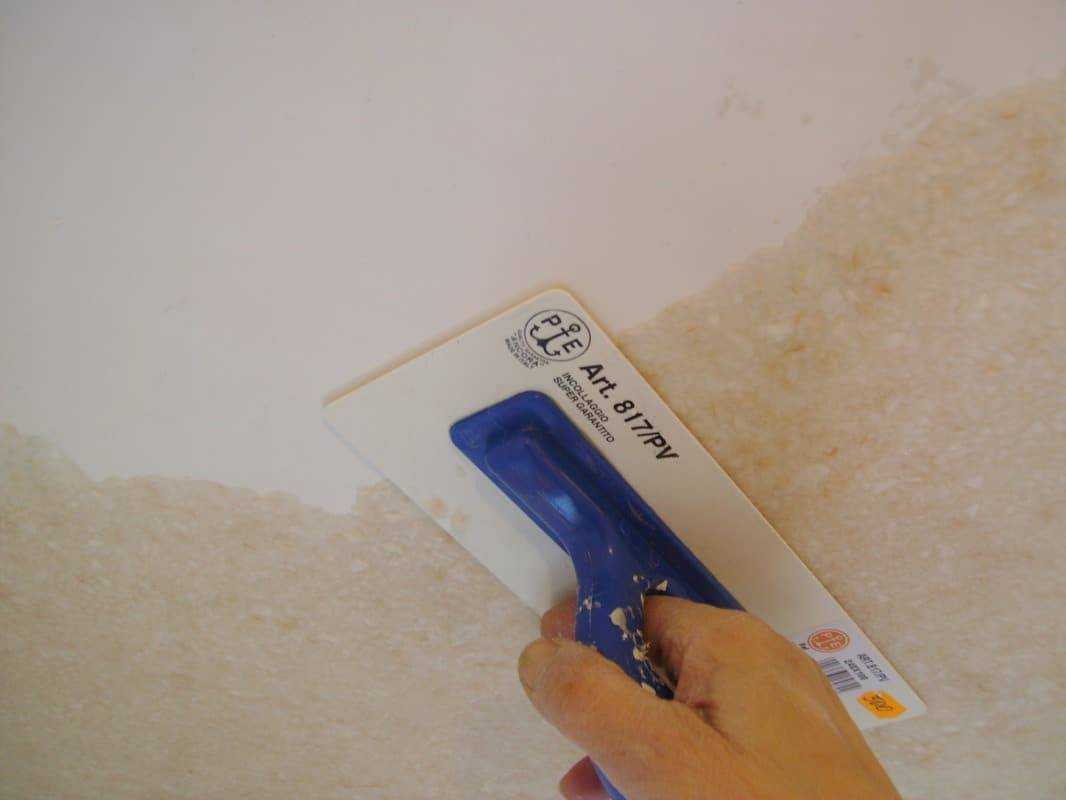 Неповрежденную смесь, нанесенную на стену, можно снять шпателем и канцелярским ножом, предварительно намочив участок губкой. Обязательно отделите друг от друга смесь участков обоев, изменивших цвет.