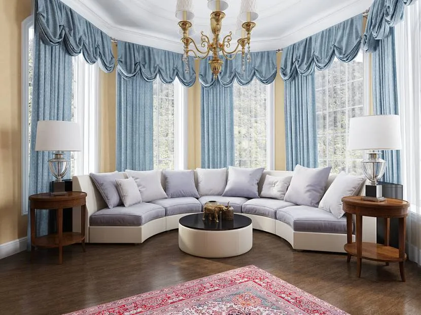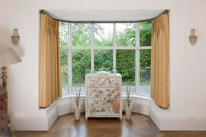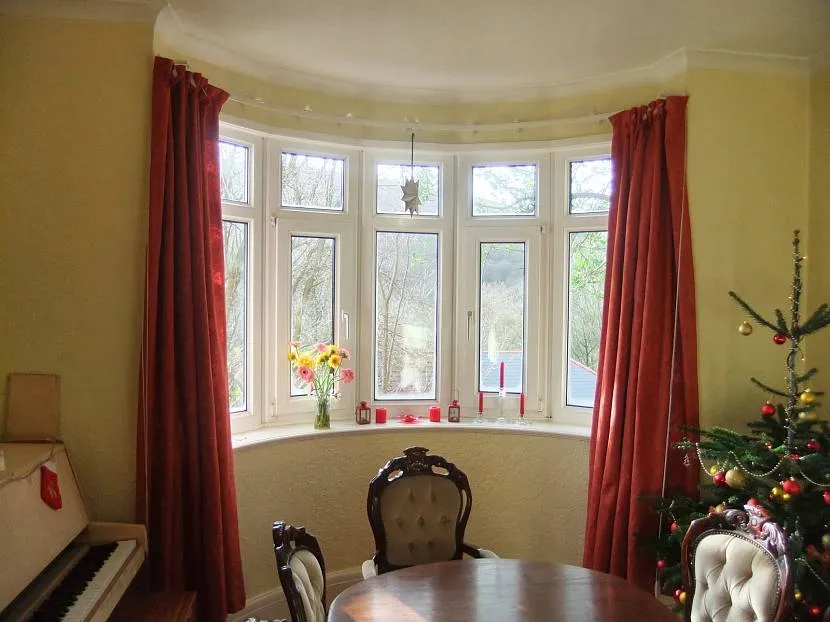 Треугольный эркер обычно предполагает стыковку стен под углом более 100 градусов. Оконные проемы здесь располагаются на двух разных стенах. В случае закругленного эркера приобретается гибкий полукруглый карниз, воедино конструкция собирается при помощи пышных ламбрекенов.