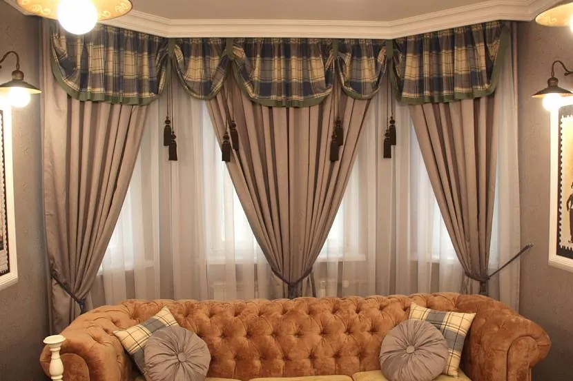 Бежевые занавески на эркерные окна с клетчатым ламбрекеномИсточник ст.шторы-а.рф