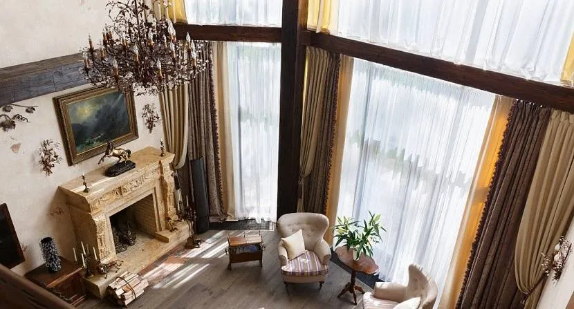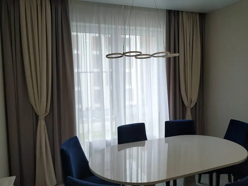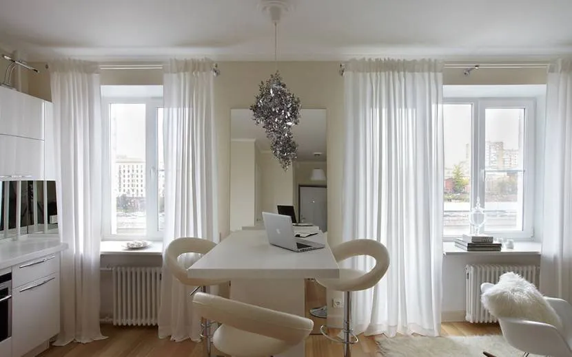 - Ткань портьер и занавесок для зон гостиной и кухни должна быть одинаковой, даже при шторках разной формы и длины.
