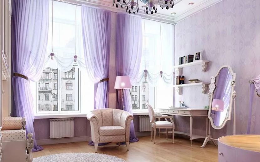 Оттенок из нежной палитры синего придает комнате воздушности, легкости. Правильное оформление штор позволяет подчеркнуть прозрачность и воздушность. Комната получается одновременно уютной и чистой. Для этой цели используют легкие занавески: вуаль, тюль, кисею.