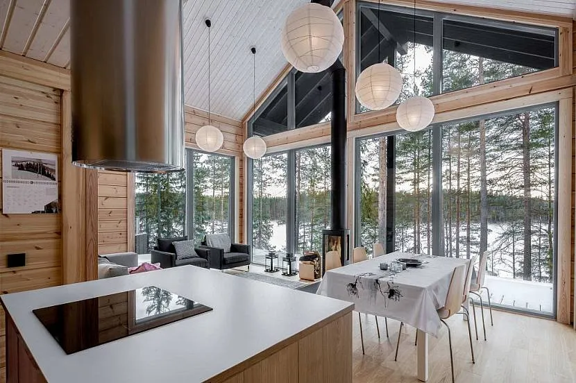 Окна от потолка до пола часто используют для обеденной зоны. Красивый пейзаж за окнами дополнит трапезу, хорошая освещенность позволит обойтись без искусственной подсветки в светлое время суток.