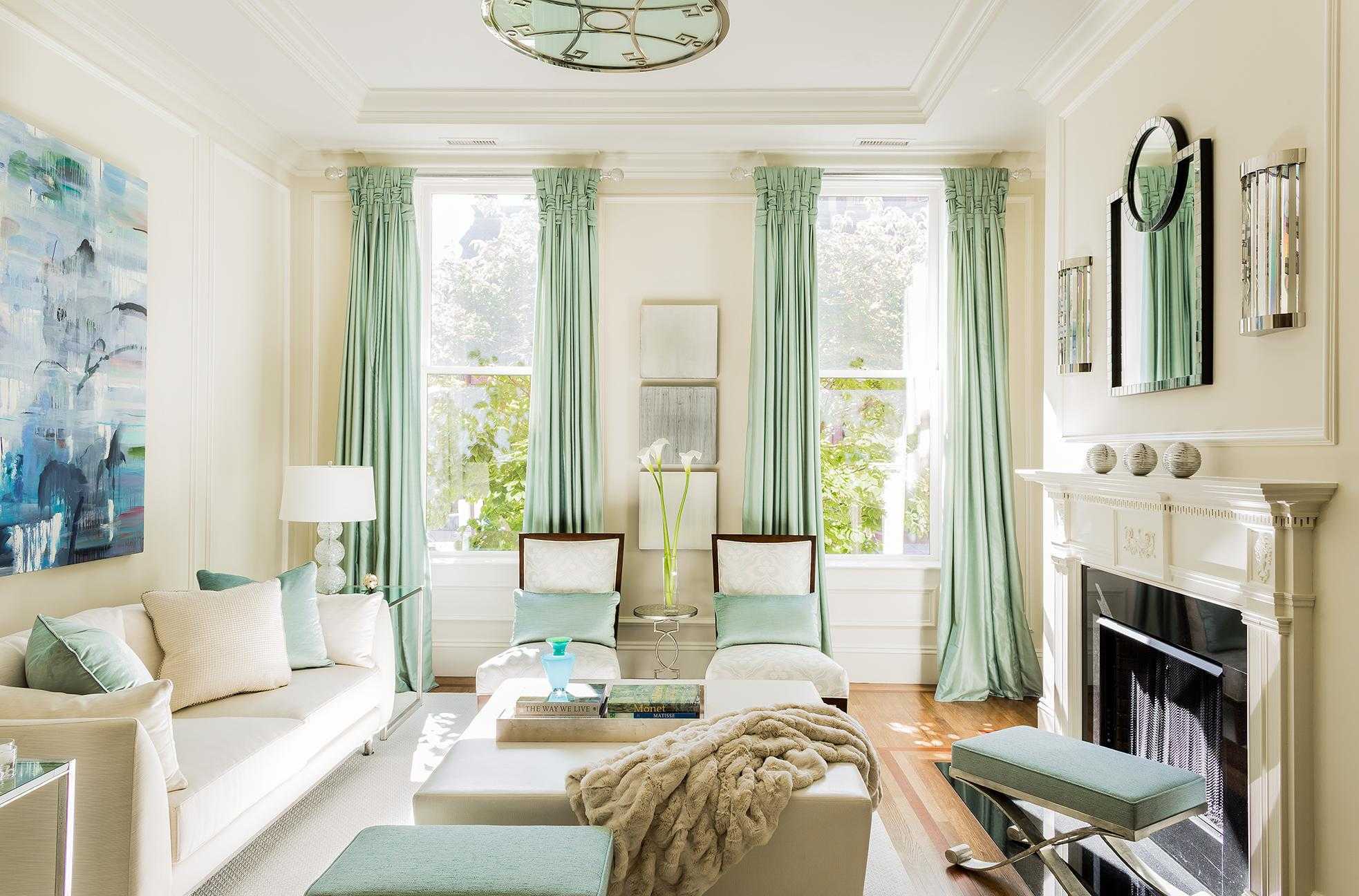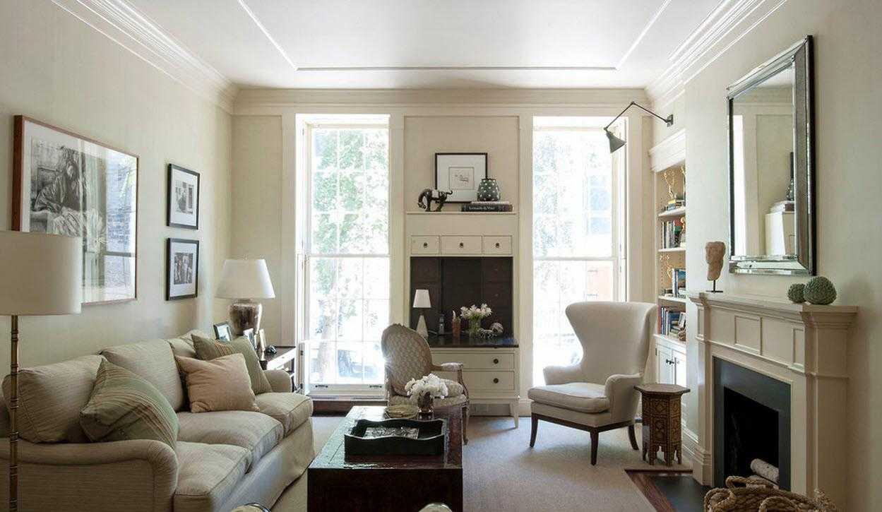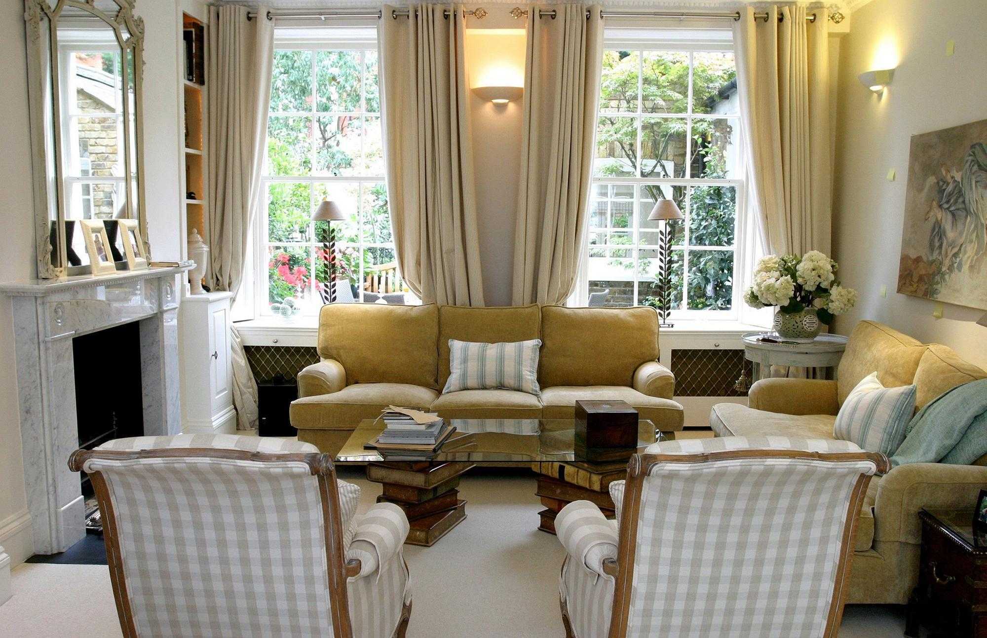 Кремовая гостиная с камином с двумя окнами на одной стене