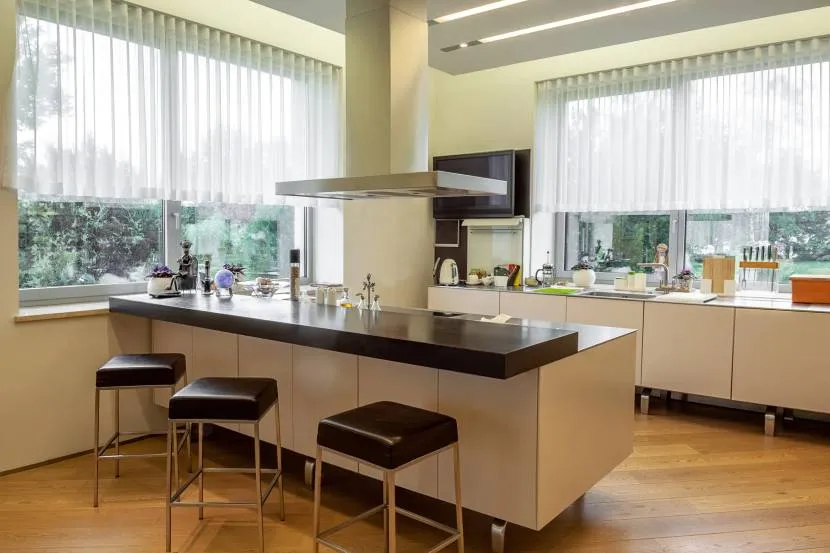 Второй приемлемый варрант оформления – римские или бамбуковые шторы, а также жалюзи из алюминия или пластика. Текстиль для штор в кухню гостиную выбирают в соответствии со следующими правилами: