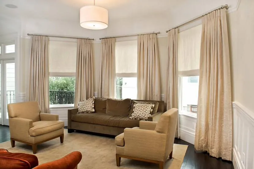 Такой акцент умиротворяет, притягивает внимание, приносит спокойствие. В эркерной зоне с бежевыми шторками приятно отдыхать и проводить свой досуг
