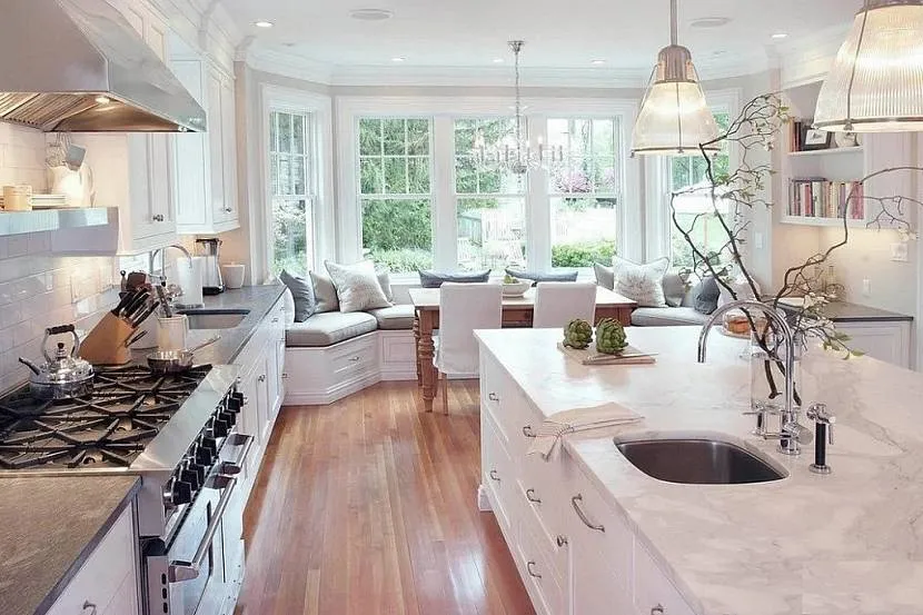 Кухонное пространство включает 3 основные зоны: рабочую, обеденную и место для хранения продуктов и утвари. При выборе дизайна больших окон учитывают размеры помещений, их планировку и характер использования каждой зоны. В загородных домах на кухнях с большой площадью делают стеклянные стены и интегрируют их с дверьми, которые ведут на балкон, террасу или во двор.