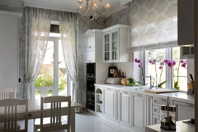 Занавески на окна с мойкой удобнее повесить те, что имеют механизм подъёма, т.е. римские или рулонные шторы либо жалюзи. Так вы сможете удобно закрывать и открывать обзор.