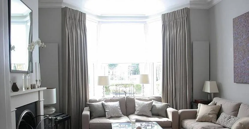 Серые занавески для эркерных окон с красивой драпировкой и складкамиИсточник yandex.ua