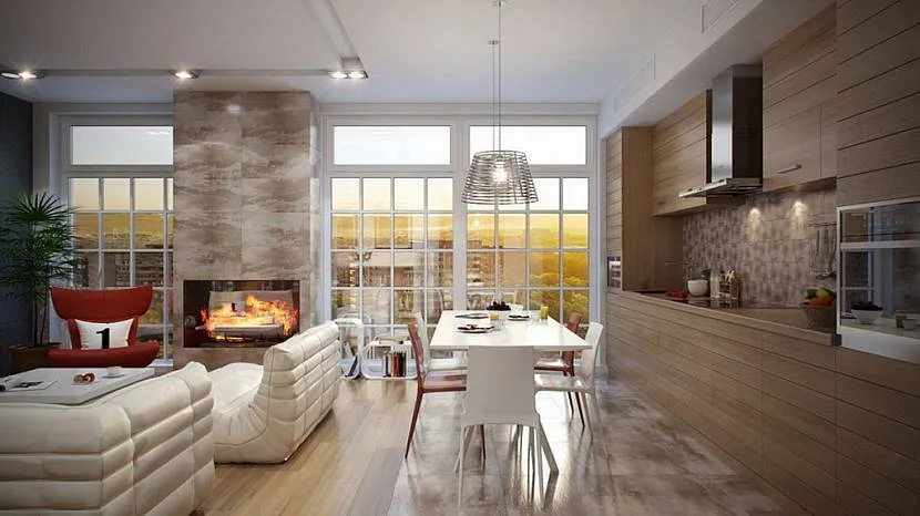 В последнее время камин становится неизменным атрибутом гостиной. Интерьер с этим солидным атрибутом всегда преображается в лучшую сторону. Отличной заменой камину между окнами на одной стороне станет плазменный телевизор. Эти предметы, вставленные в нишу, помогут разграничить зал на кухню и гостиную. Если между оконными проемами достаточно много места, то можно поставить между ними диван.