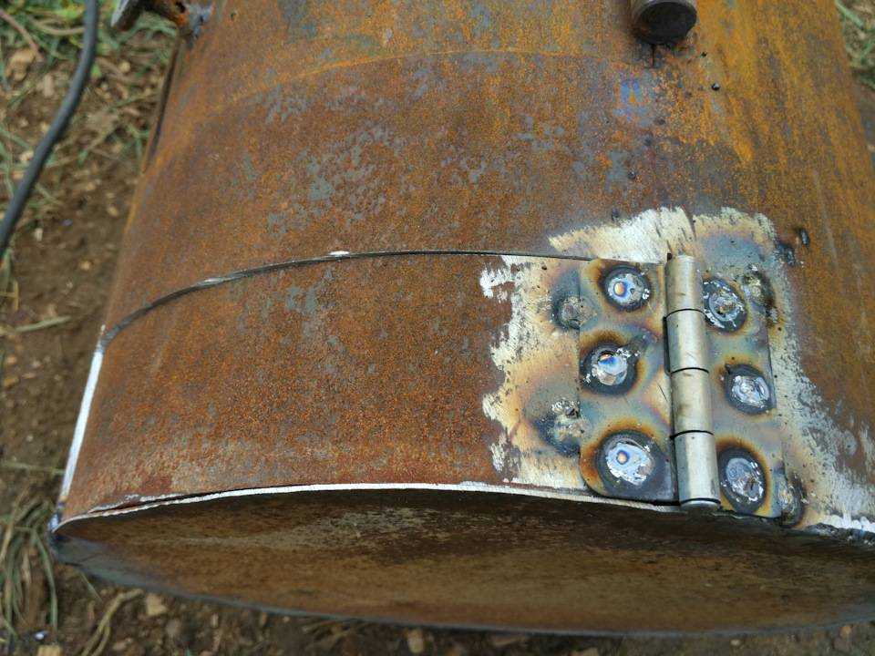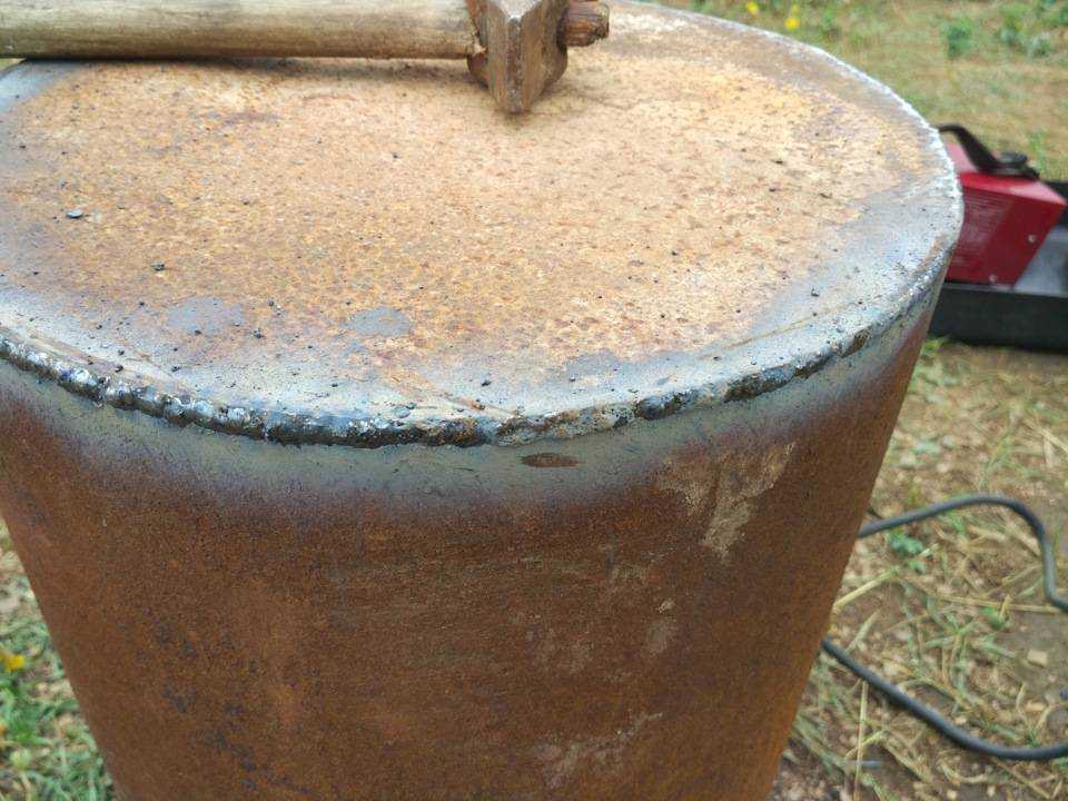 Посредством сварочного аппарата соединяем сталь в цилиндр, привариваем к готовой конструкции донышко, затем опоры и ручки. Впрочем, последние части конструкции можно прикрутить болтами, предварительно просверлив отверстия в металле.