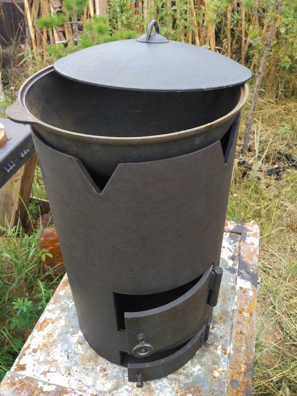 Наиболее простой мобильный вариант печи для казана – цилиндрическая топка из листового металла с отверстием для закладки топлива и прорезями для выхода дыма. Казан ставится на печь сверху, при этом две третьих донышка находятся непосредственно над огнем.
