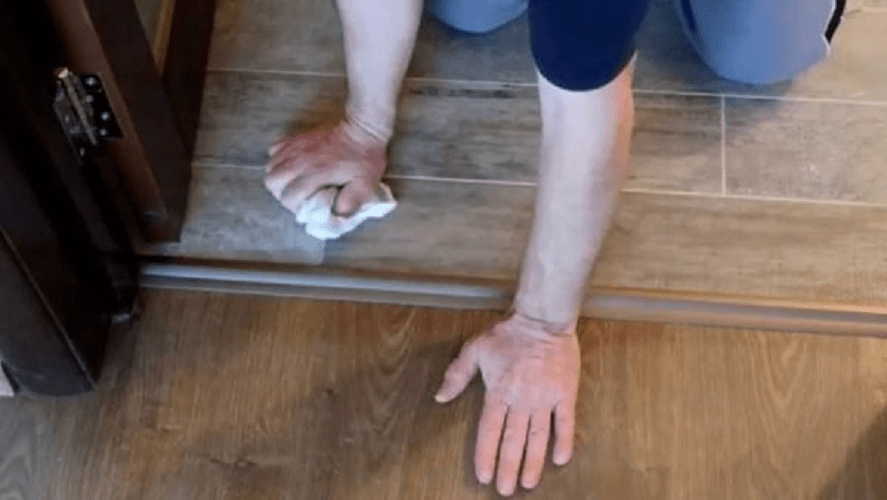 - Клеевой укладкой. В этом случае используется влагостойкий тип ламинатного покрытия. При укладке ламелей на пол кухни торцы промазываются в замковых соединениях герметиком или специальной эластичной клеящей массой. В итоге в кухонном помещении получается покрытие, способное выдержать небольшой и кратковременный разлив воды;