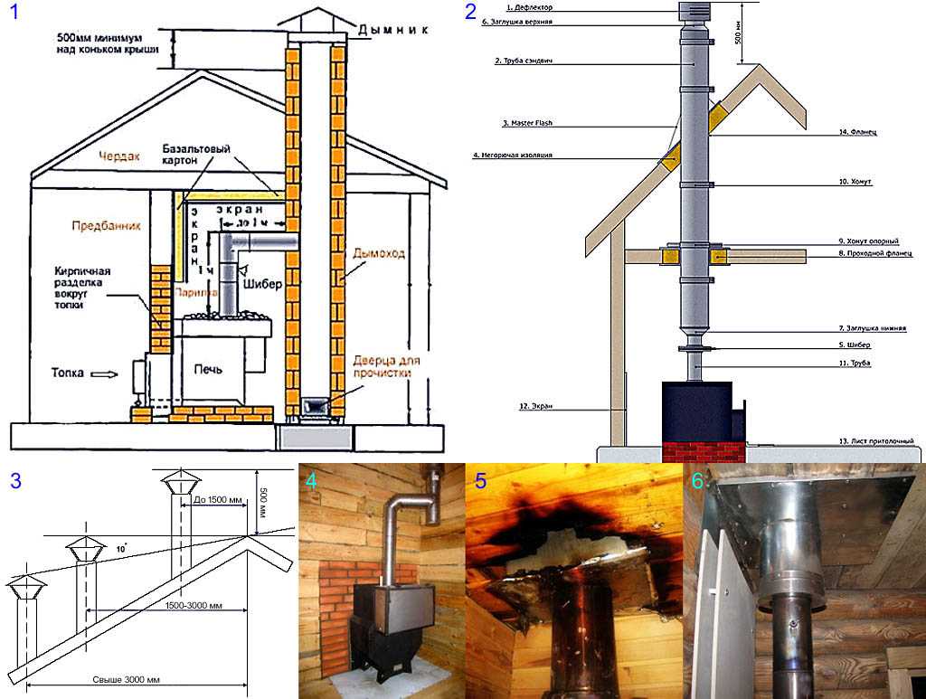 В баню нужно закупать или делать своими руками уширенную потолочную разделку дымохода 460х460 или, если шаг потолочных балок позволяет, 600х600 мм. Дополнительно, стены, отстоящие от неизолированной части дымохода менее чем на 700 мм, защищаются двойными экранами из базальтового картона, поз. 6. Баней с таким дымоходом можно будет пользоваться систематически, подолгу и часто даже в режиме жгучего пара.