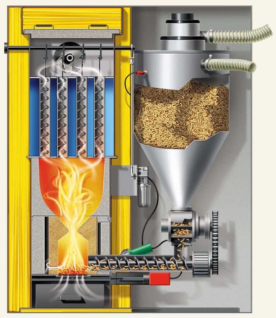 Принцип работы оборудования последовательный. Первоначально засыпают пеллеты в бункер, оттуда они при помощи шнекового конвейера ссыпаются в топку, где сгорают. Выделившиеся при горении газы подвергаются нескольким ступеням сгорания (две-три) в разных камерах, что обеспечивает полную выработку ресурса гранул. Отопительные приборы на пеллетах обладают очень высоким показателем КПД — до 98%.