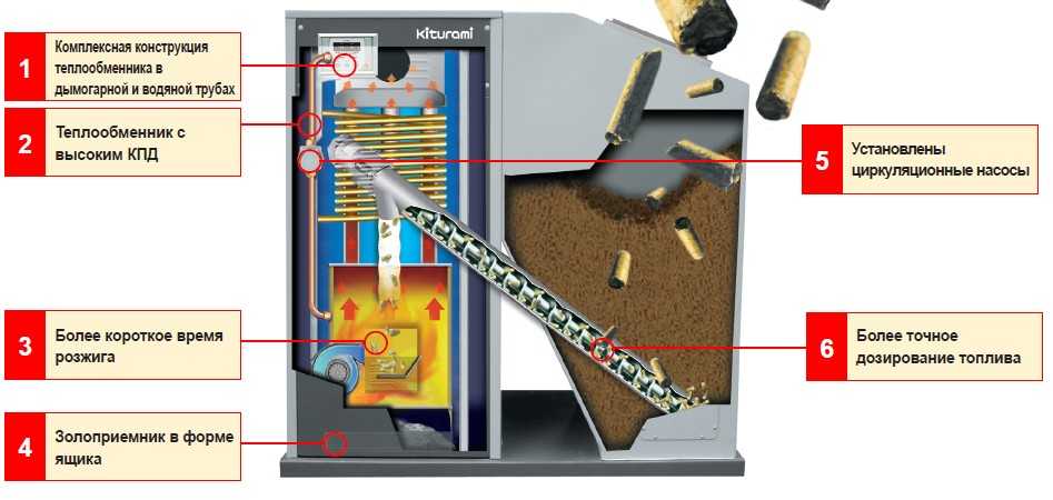 Теплообменник, который длают из стали или чугуна, оснащен автоматической электронной системой управления. Регулируется температура теплоносителя за счет подачи определенного количество топлива на сгорание. Программируют подачу пеллет понятными настройками. Можно заранее настроить функцию перехода режима горения с одного типа топлива на другое. Если основной тип закончился, устройство автоматически поджигает подготовленные в отдельной топке дрова или работает на угле.