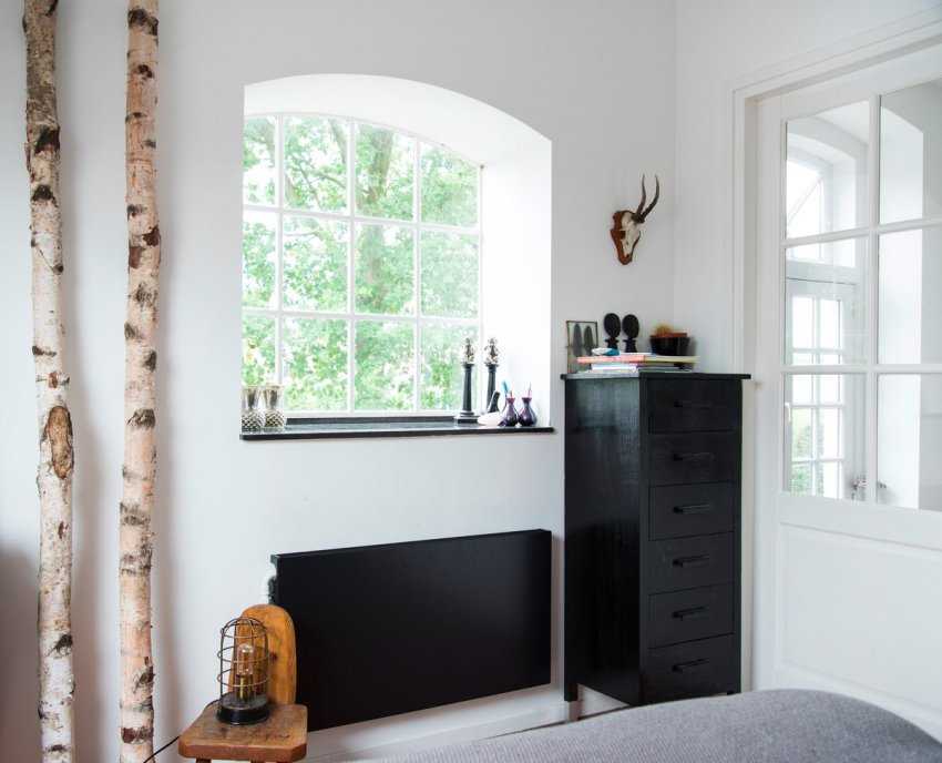 В случае, если радиатор уже утоплен в нишу под окном, то подойдет плоская панель, как навесная, так и передвижная, на ножках. Такая легкая конструкция отлично справляется с декоративными функциями и не занимает полезную площадь.