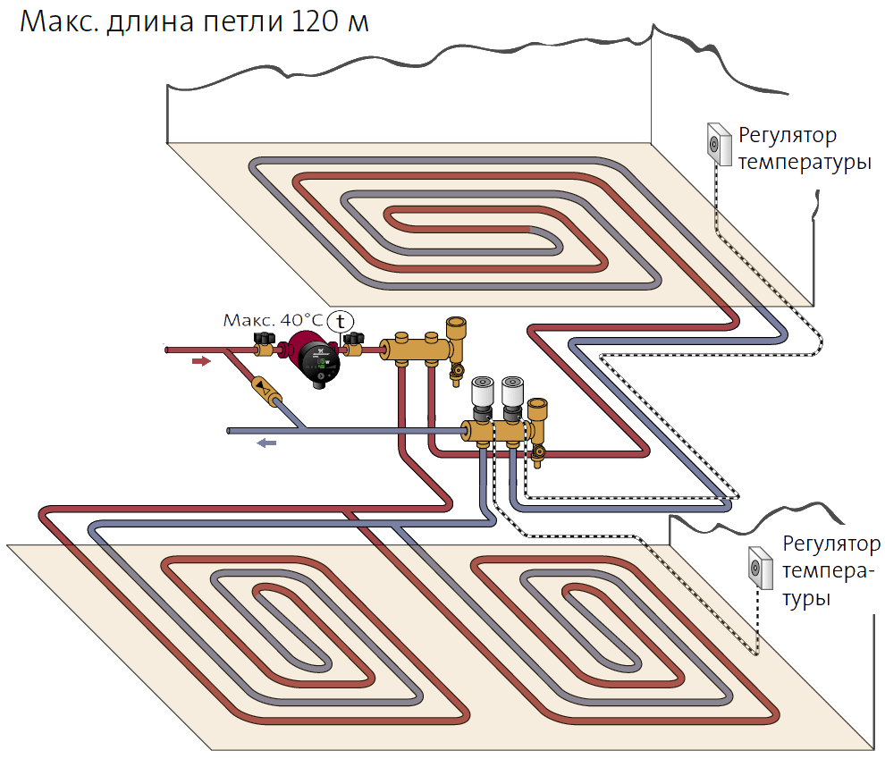 Теплоноситель от котла будет попадать в распределительный коллектор и поступать по петлям. Далее теплоноситель попадает обратно в котел. Последний должен быть настроен на необходимую температуру