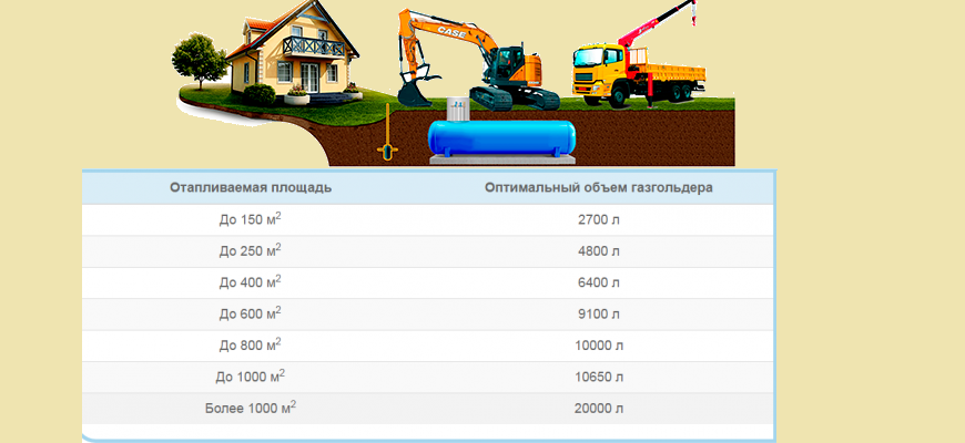 Объем бака может составлять от 2,5 до 20 м³. Необходимая величина зависит от размера дома, количества подключенных устройств и потребляемого количества топлива. В среднем в теплых районах страны расходуется 25-30 л газа на 1 м² площади дома. Можно исходить из мощности отопительного котла: на 1 кВт приходится около 100 л газа в год.