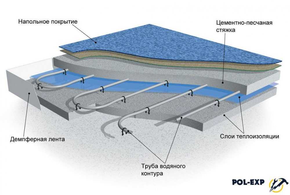 - Слой бетонной стяжки. Заливается поверх подведенной и подключенной системы.