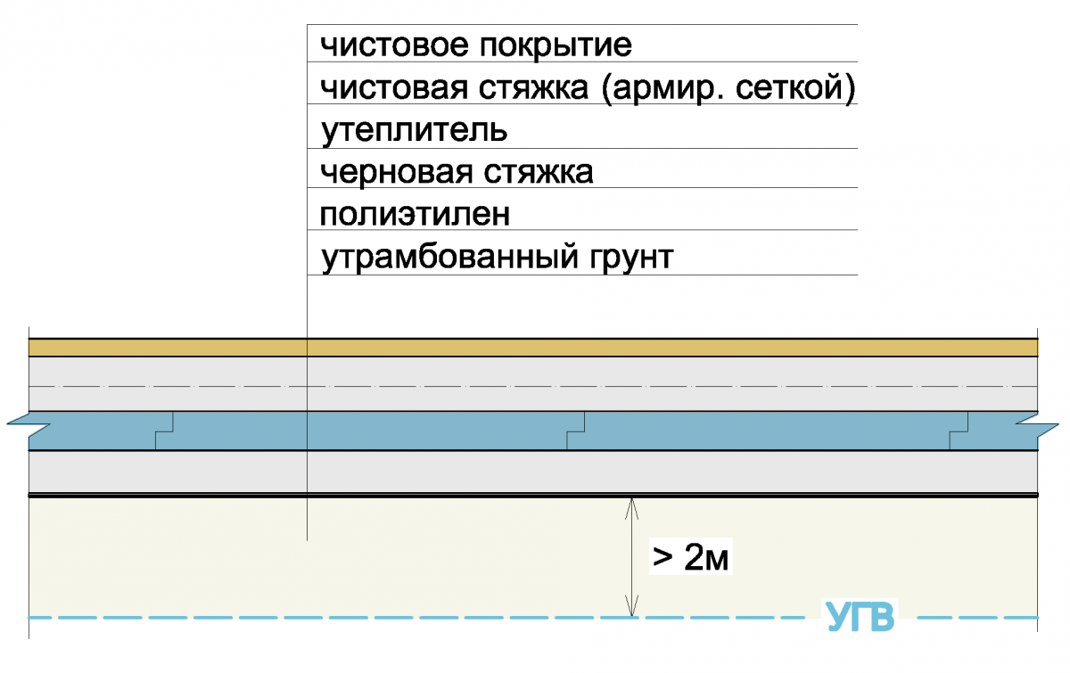 Пол по грунту – это многослойная конструкция. Ее особенности и свойства напрямую связаны с качеством и характеристиками грунта. Основное требование связано с грунтовыми водами, которые должны располагаться ниже 5 м. от поверхности земли. Это исключит подвижность и пучение грунтовых масс.