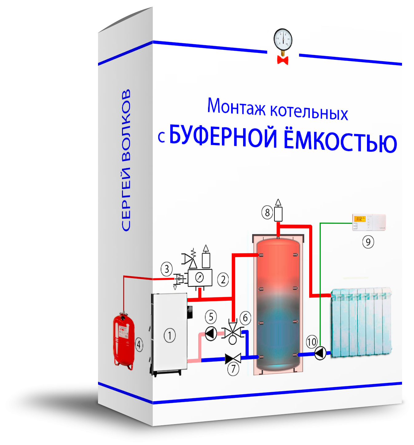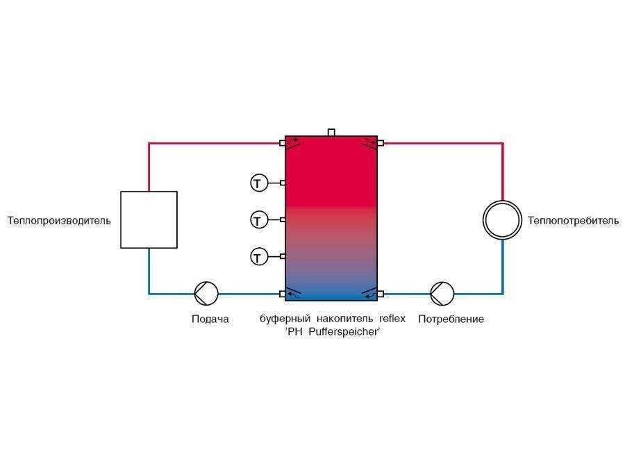 В буферную ёмкость при помощи циркулярного насоса 1 подаётся вода, нагретая котлом. Столько же воды (но уже остывшей) соответственно возвращается в котёл. Из верхнего отдела буферной ёмкости насос 2 подаёт горячую воду к радиаторам. А в нижнюю часть буферной ёмкости возвращается соответствующее количество остывшей воды. Насос 1 функционирует во время горения котла. А работа насоса 2 регулируется при помощи комнатного термостата: в зависимости от того, какая температура в помещении, он может выключить или включить насос.