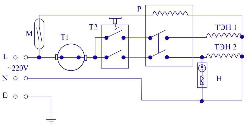 — температурные датчики. В случае опасного перегрева ТЭНов срабатывают на их отключение и таким образом защищают от выхода из строя; - ТЭН1, ТЭН2