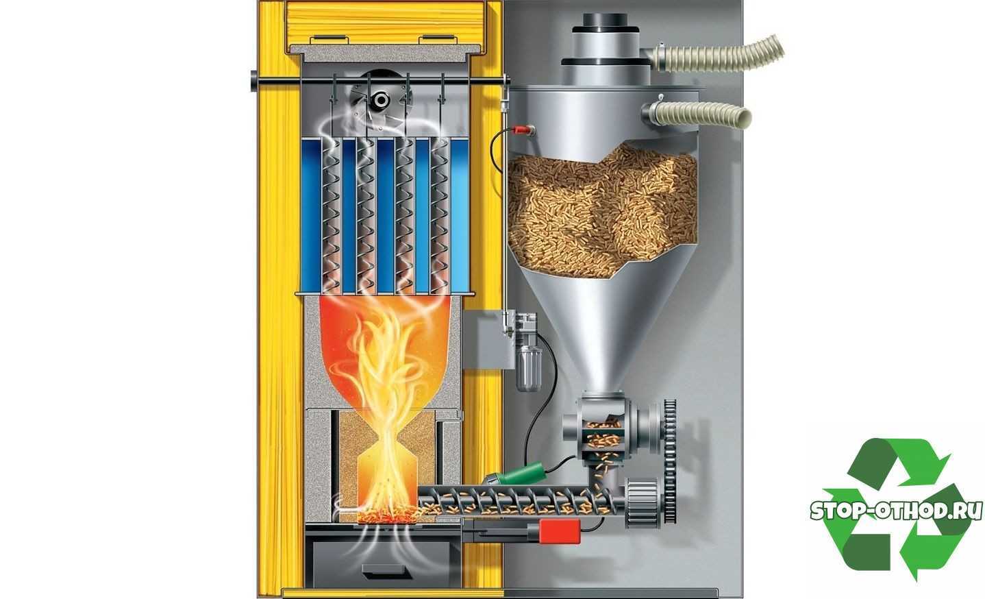 Основным минусом твердотопливного теплогенератора считается нередкая загрузка древесины или угля. Чтобы убрать его, необходимо автоматизировать топливную подачу, но это не очень просто, устройство для загрузки головешек пока еще не придумано. Однако если горючее имеет сыпучую структуру, то обсудить вопрос намного легче, что и было выполнено в соответствующих отопительных агрегатах. По типам сжигаемой сыпучей биомассы они разделяются на такие варианты: